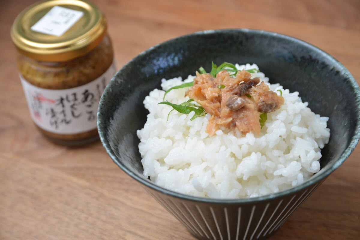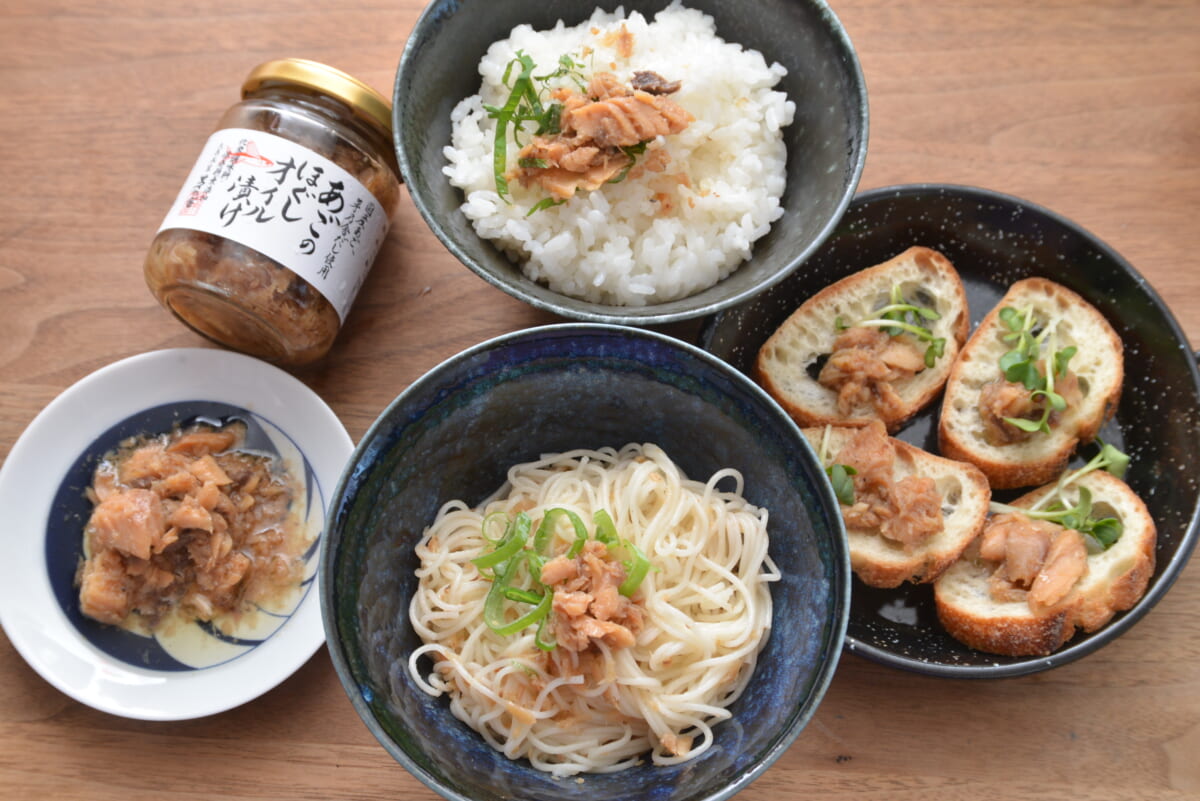 まずはそのまま味わってみました。食感として近いのは鮪や鰹のオイル漬け缶詰ですが、あごはそれらの魚とは違った力強さや香ばしさを感じます。また、だしで味付けされているのでまろやかなうまみが抜群。しかも、それはあの「茅乃舎だし」。上品な風味が凝縮されていて、全体的にワンランク上のおいしさとなっています。