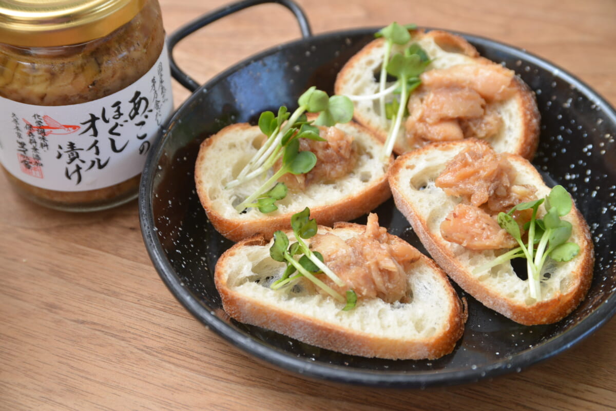 洋風のフィッシュカナッペならオイルサーディンやアンチョビ(いわし)かもしれませんが、「あごのほぐしオイル漬け」にはイワシのシャープさやビター感がない一方、だしの効果でうまみがボリューミー。すっきりとしたビールや、日本ワインの白、ジャパニーズウイスキーハイボール、スパークリング日本酒などがよく合うと思います。