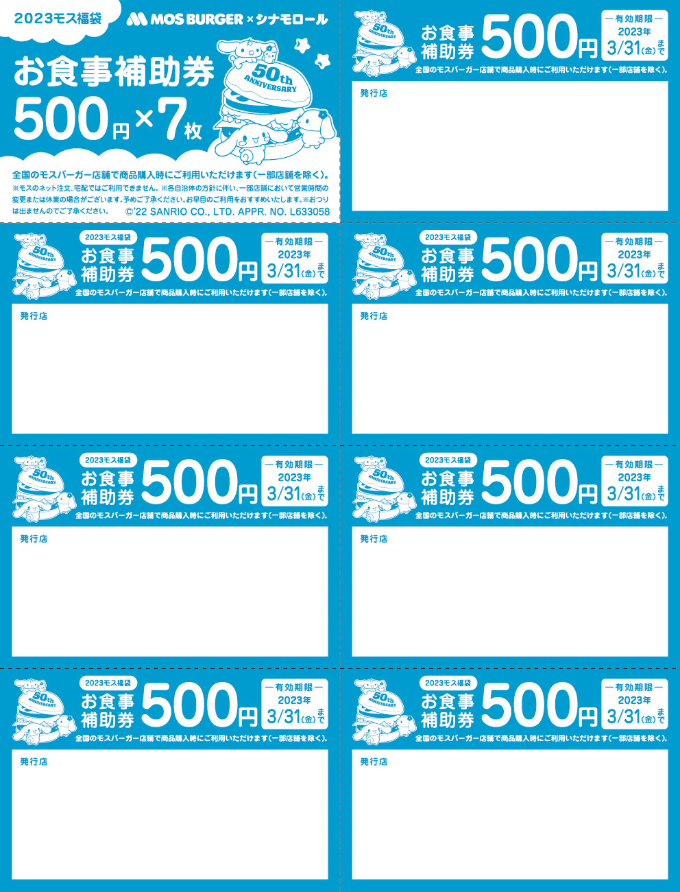 福袋の中身は、「ふんわりブランケット」、「ふわふわヘアバンド」、「ミニポーチ」、「ポケットミラー」、「お食事補助券 3,500円相当(500円×7枚綴り)」で、シナモロールデザインの専用袋に入っています。お食事補助券の有効期限は2023年3月末まで。