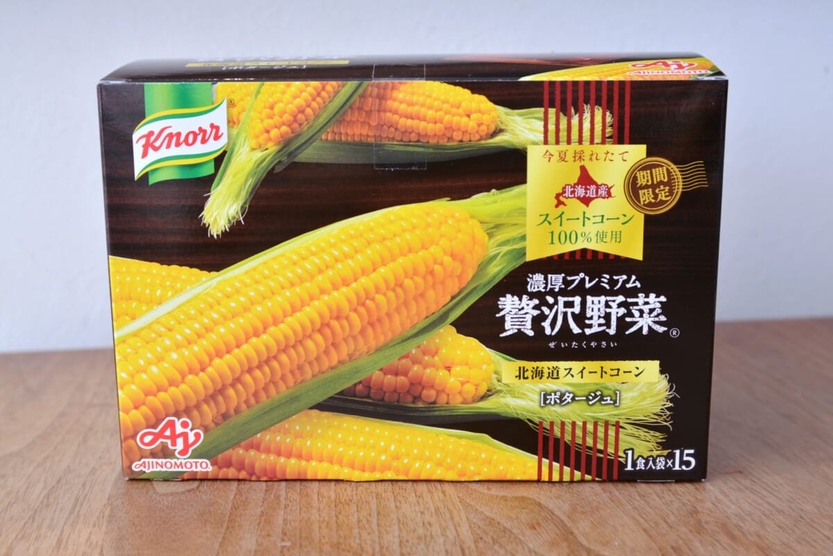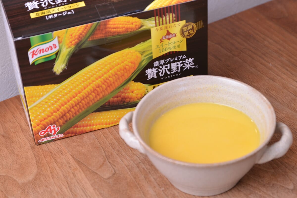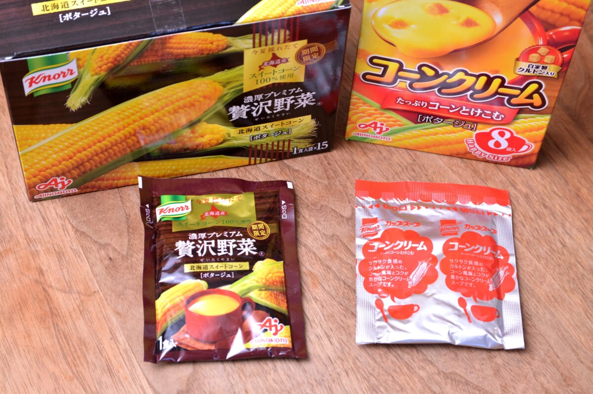 同シリーズには<完熟トマト>と<栗かぼちゃ>もありますが、今回は<北海道スイートコーン>をピックアップ。市販品の大定番品「クノール カップスープ」のコーンクリームと飲み比べてレポートします。