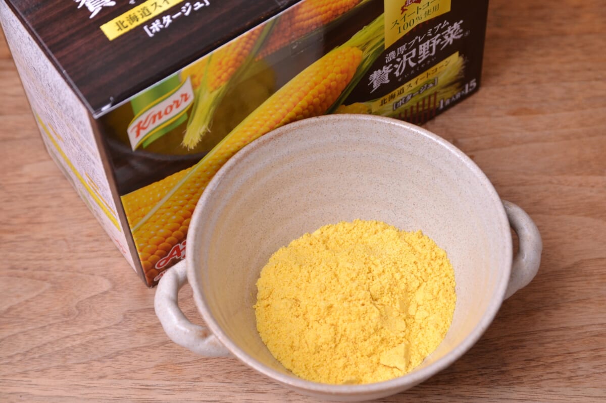 そして使用量もまさに贅沢。「クノール カップスープ」コーンクリームとの比較で、スーパースイートコーンを2倍も使っているとのこと。実際に両商品をそれぞれ開封して見比べると、確かに違いがよくわかりました。