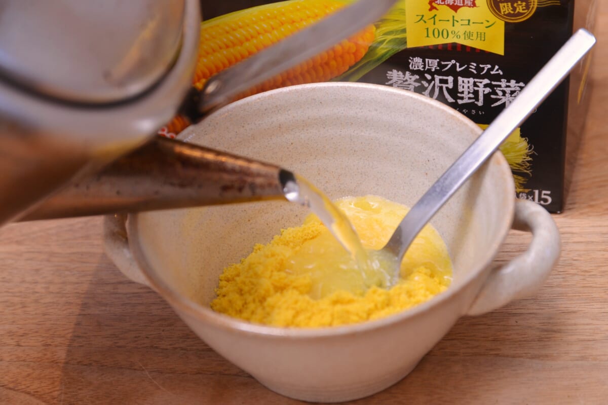 「クノール カップスープ」コーンクリームも指定農場のスーパースイートコーンを使い、収穫から24時間以内にパウダー化はしているものの、色だけでも違いがはっきり出るのは興味深いところ。では味の違いはどうか。いよいよ熱湯を注いで飲んでみます。
