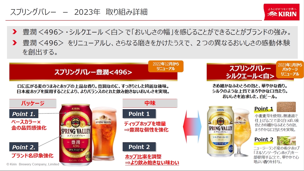 この新しい仕様へは、缶がこの1月から、ビンと生樽は2月製造品より順次切り替えられるとか。では次に、キリンのクラフトビールにおけるフラッグシップブランド「スプリングバレー」のポイントも紹介します。