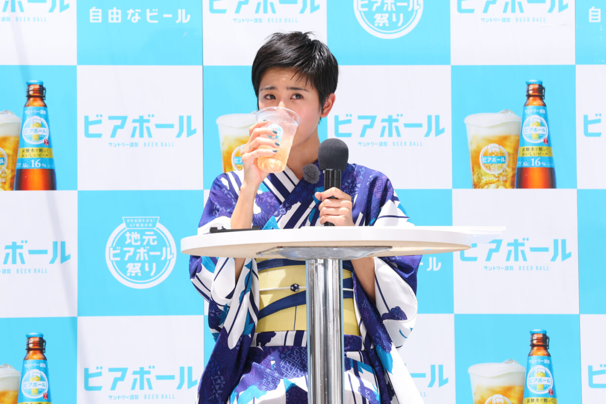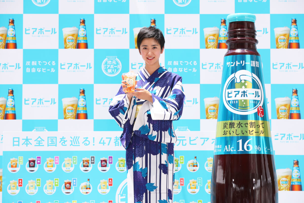 同発表会では、黒島結菜さんとダイアンのユースケさん、津田篤宏さんが浴衣姿で登場。人生初だというベリーショートの髪型を披露した黒島さんに、ダイアンの2人は「とてもお美しい!」と大絶賛だった。その後、色と香りだけで地元ビアボールの素材を当てるクイズでは、黒島さんが地元沖縄の「アセロラ」と回答し、見事正解。沖縄方言で「でーじまーさん(とってもおいしい)!」と、大満足の様子だった。