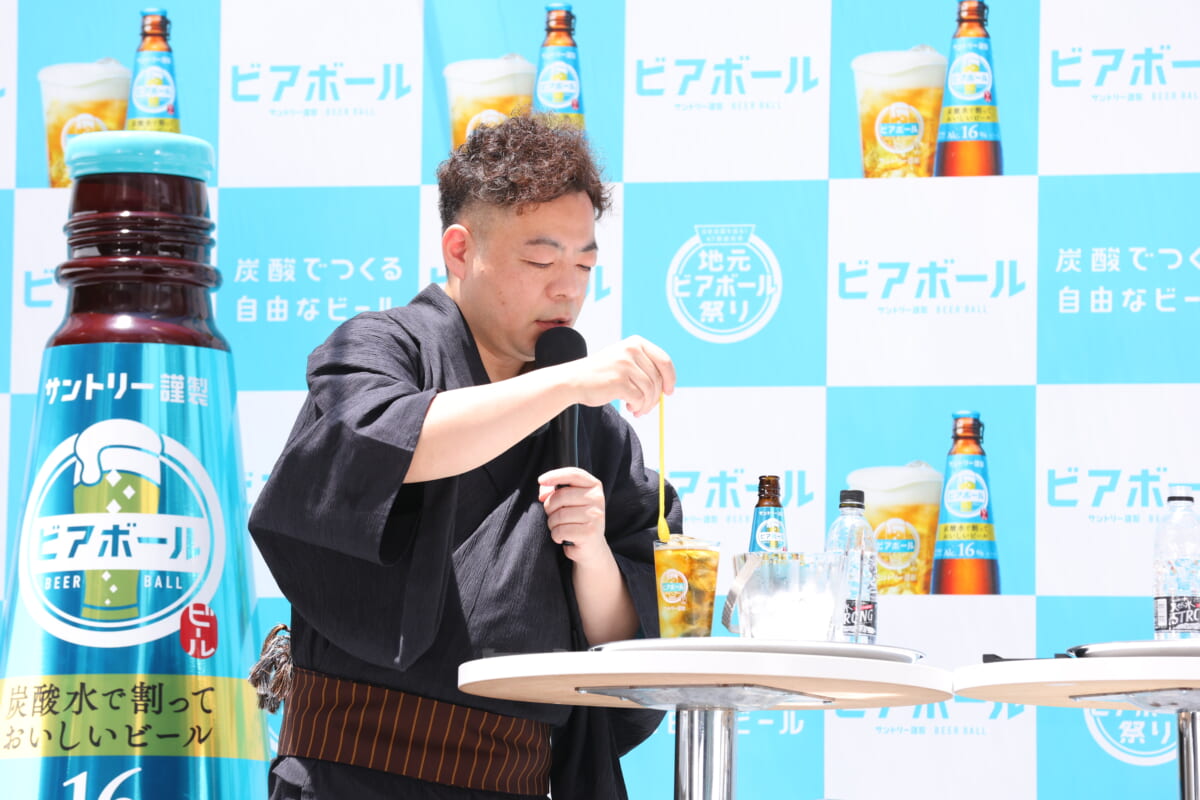 さらに、ビアボールが初めてだというダイアンに黒島さんがビアボールづくりをレクチャー。定番ビアボールはビアボール1に対して炭酸水3だが、ダイアンのユースケさんは自分好みに調節できる点を活かして1:1で作り「濃い目に作ってもおいしい!」と大喜びだった。