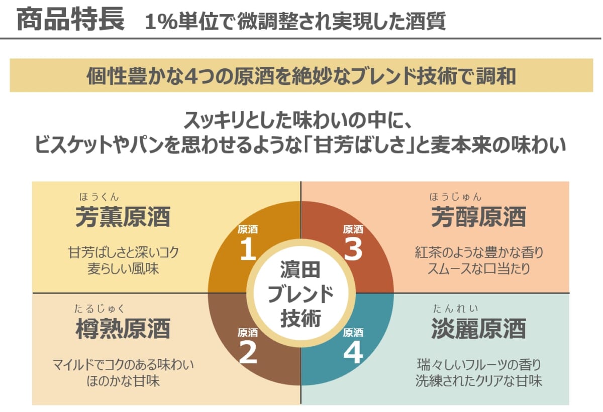 本格麦焼酎「うかぜ」は、個性豊かな4つの原酒を1%単位の高いブレンド技術で調合。こだわりのブレンド比率を同社では「音楽に例えると四重奏。その名も『カルテットブレンド』です」と紹介。開発期間15か月、試作100パターンという開発過程を経て、スッキリとしていながらビスケットやパンを思わせる “甘芳しさ” と麦本来の味わいを実現した。