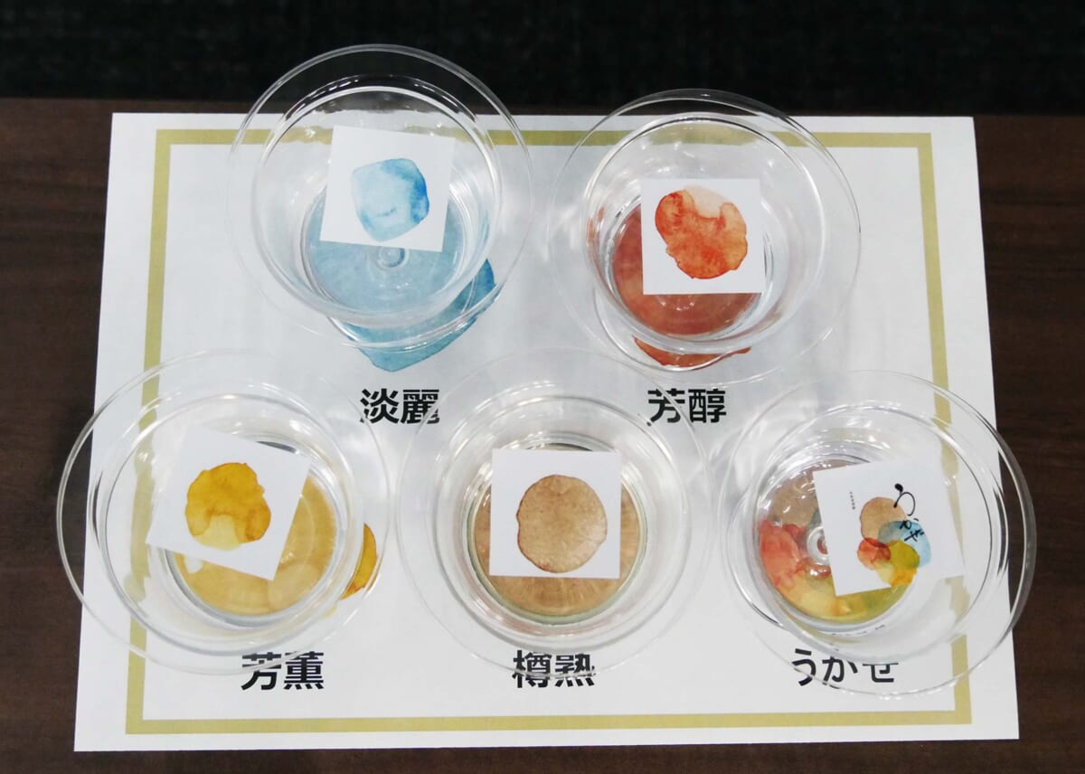 「うかぜ」にブレンドされている4つの原酒は「芳薫(ほうくん)原酒」「芳醇原酒」「淡麗原酒」「樽熟原酒」。試飲では、4つの原酒をそれぞれ味わうことができた。