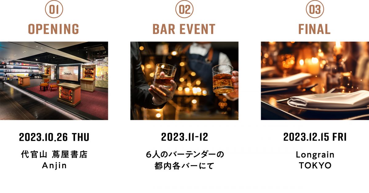 「Dewar’s Discovery Session 2023」のバーイベントは、11月3日(金)に「TIGRATO」からスタート。1週間ごとに各店舗でオリジナルカクテルが期間限定で提供中だ。また、12月15日(金)にはLongrain TOKYOにて、カクテルと同じ食材を使用した料理とともにオリジナルカクテルが提供されるファイナルイベントも開催される。いずれも詳細は特設サイトで確認できる。