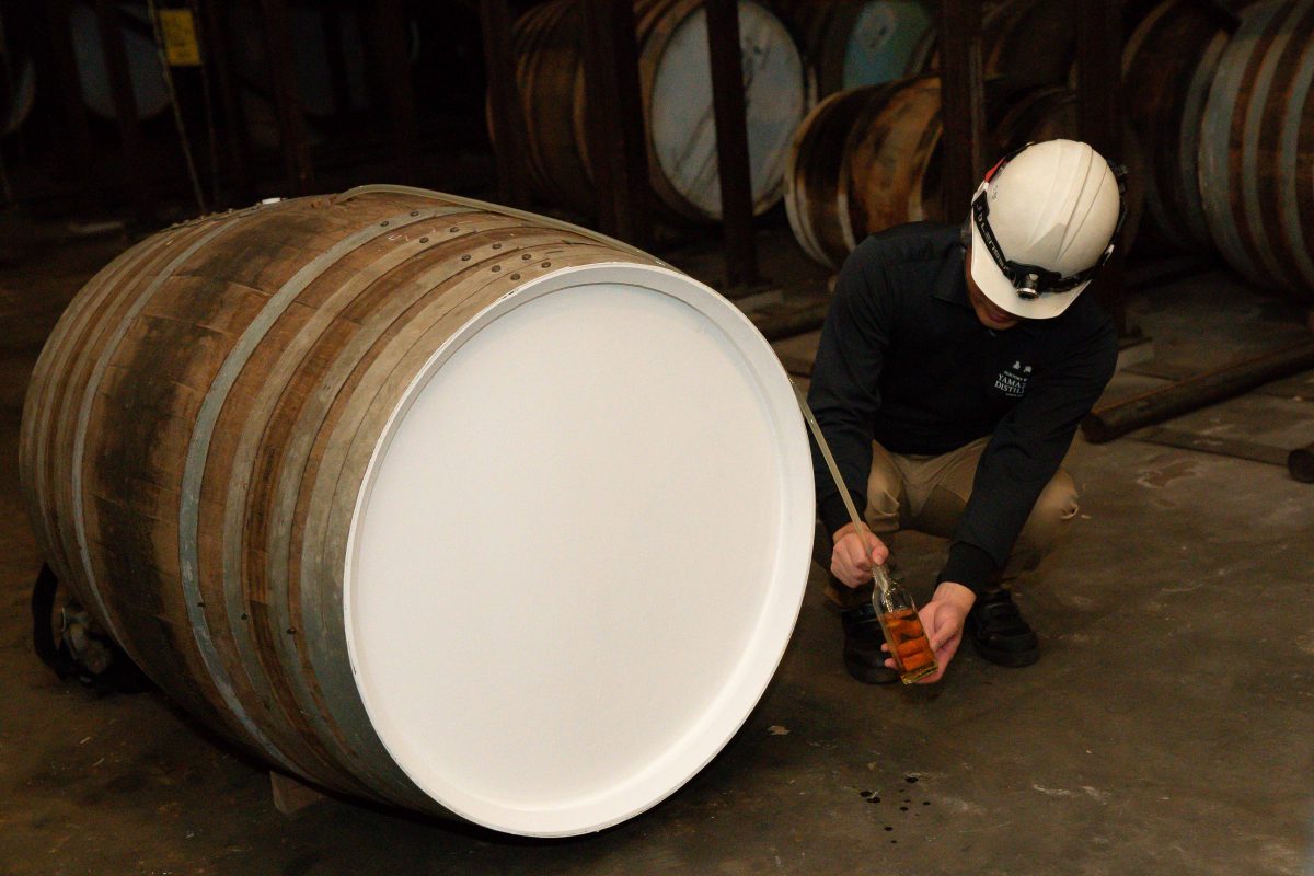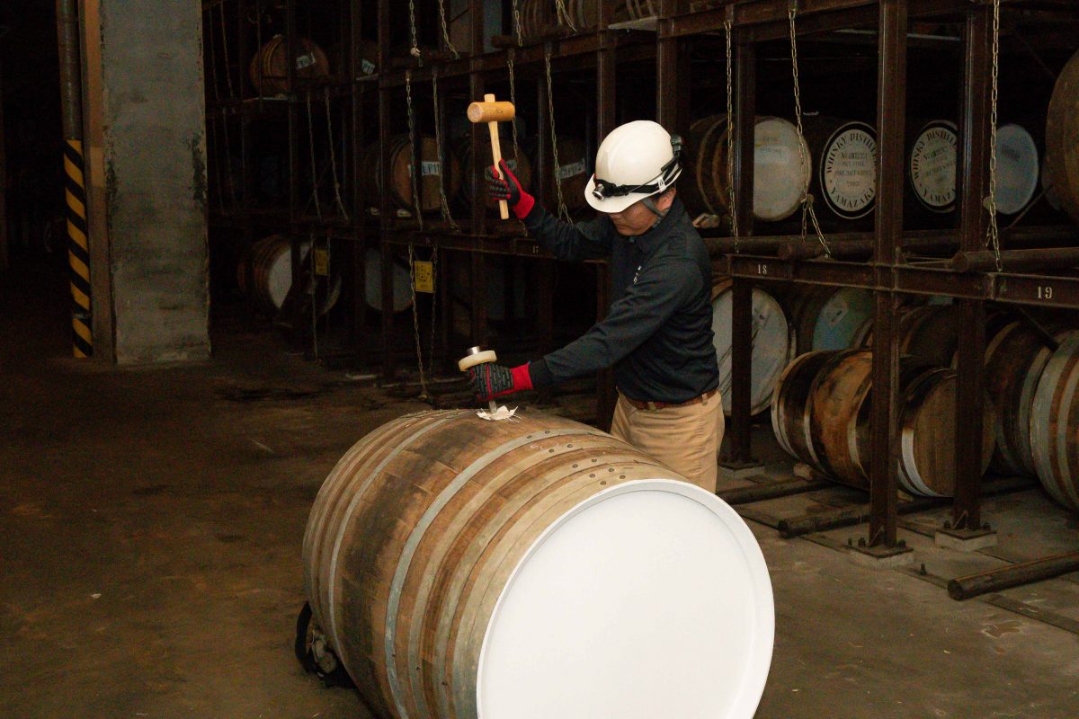 後熟庫でのサンプリング作業は、いわば熟成原酒の品質チェック。樽のダボ栓をハンマーとノミで開け、そこから原酒をボトルへ移すまでの工程となります。開けたての原酒を拝見できる、非常に貴重な体験であるといえるでしょう。
