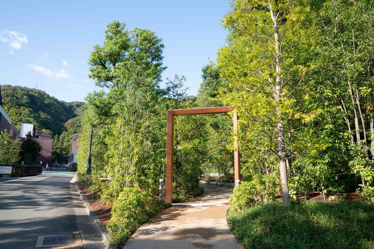 ここからは改修ポイントを紹介していきましょう。まずはエントランスです。こちらは、敷地内に自然との調和を表現した「杜(もり)」を形成する狙いで、周辺エリアの島本町や大山崎町の山林地に生育する草木などを植栽し緑地化。