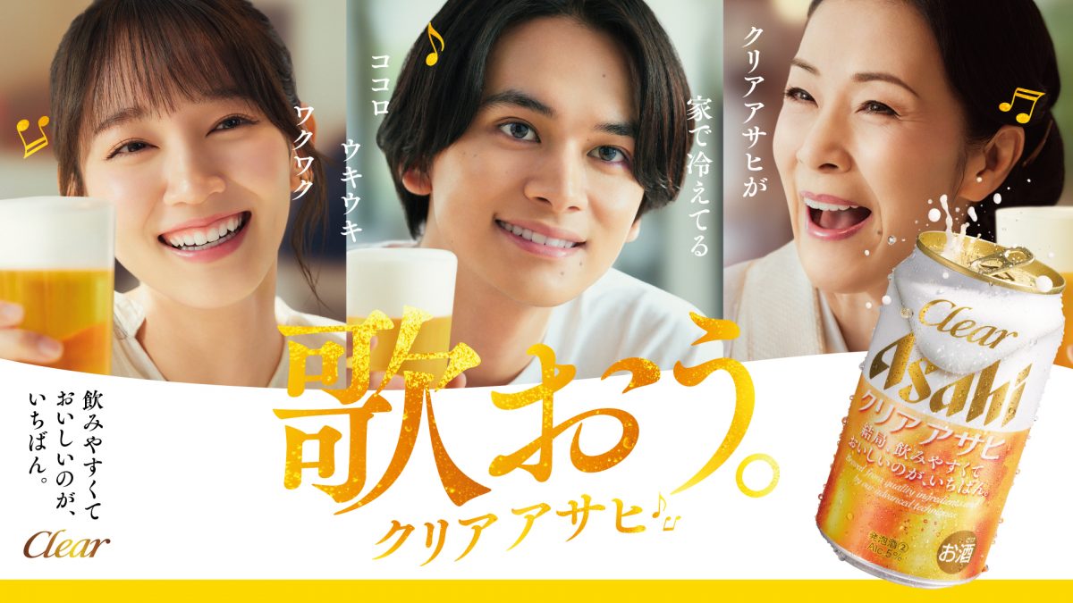 アサヒビールは、クリアアサヒのブランドコミュニケーションを「歌おう。クリアアサヒ」に⼀新し、新TVCM「100万⼈に配っちゃいます︕」篇、「飲みたくなったら、歌おう。」篇を3⽉19⽇(⽕)から放映開始。CMでは北村さん、吉岡さん、坂本さんが「クリアブギウギ」を歌い、気持ち晴れやかな⽇常を過ごす等⾝⼤の姿が披露されます。