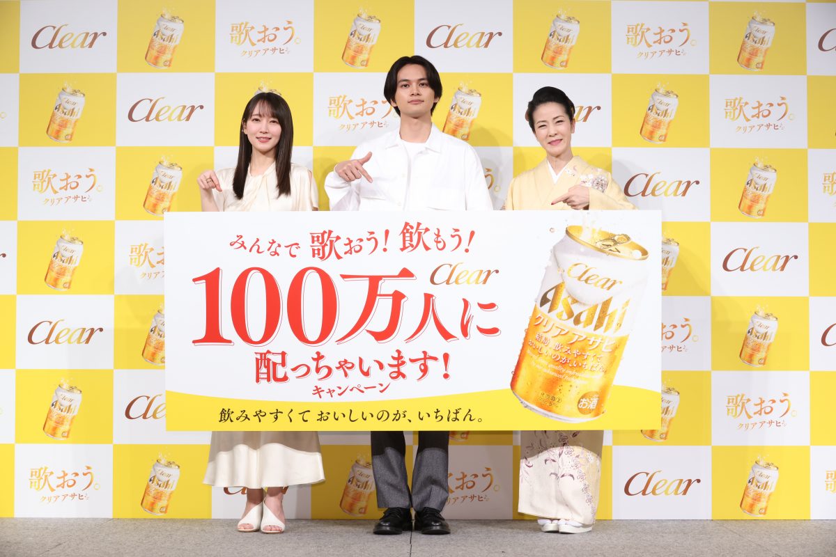 北村さんは「僕はこういうのになかなか当たらないで生きてきましたが、100万人ならいけるんじゃないかな」と期待をのぞかせ、「CMに参加してから春がはじまった気がする日々です。皆様の日常を少しでも彩れたらな」とコメント。吉岡さんも「当選されたら、一緒に乾杯している気持ちで飲んでいただけたら。私も当たりたいです」と意気込み、坂本さんは「どんどん飲んで歌っていただけたら。100万人それぞれのクリアブギウギを歌って乾杯してください!」と呼びかけました。