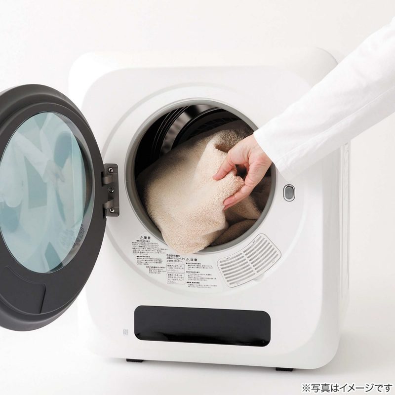 設置工事が不要な床置き型のコンパクトな回転ドラム式衣類乾燥機。最大約3㎏の衣類を約150〜210分で乾燥可能で、Tシャツ2枚、Yシャツ1枚であれば約60分で乾燥できる。