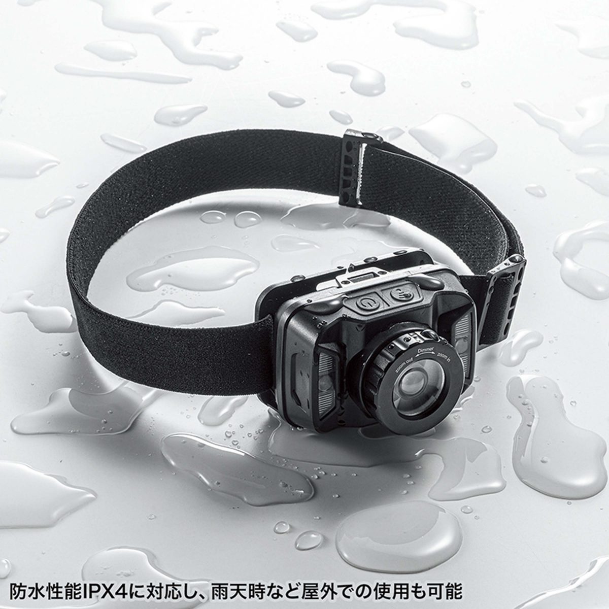 手かざしでオンオフできるモーションセンサー付きLEDヘッドライト。専用充電バッテリーだけではなく単4形乾電池でも使える。スポットからワイドまで照射範囲の調節や点灯モードの切り替えに対応し、活躍の場は広そうだ。