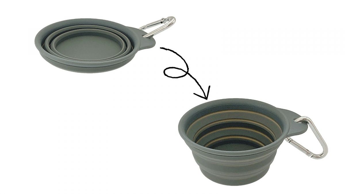 日常の散歩から災害時まで、外出中の食事や水分補給に便利なシリコン製の折りたたみ式ボウル。軽量かつカラビナ付きなので、バッグやリードなどに引っ掛けて気軽に持ち運べる。サイズはφ110(開口部)×H50(使用時)mm。