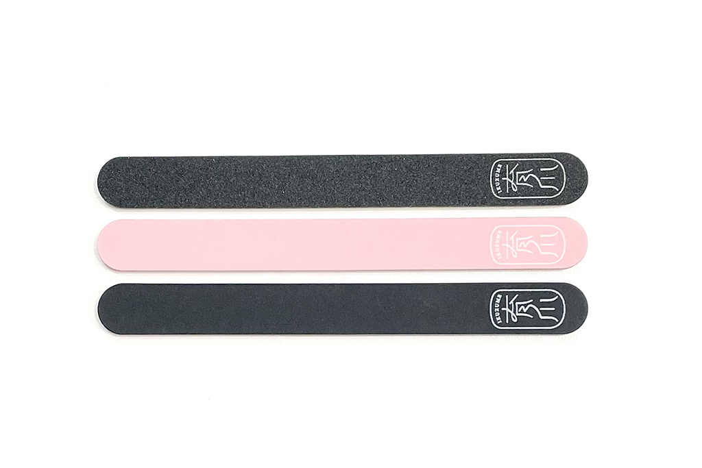 「洗って何度も使える育爪専用の紙やすりです。黒いやすりで長さを整え、ピンクとさらに目の細かいグレーで仕上げます。消耗品なので、削りにくくなったら買い換えましょう」