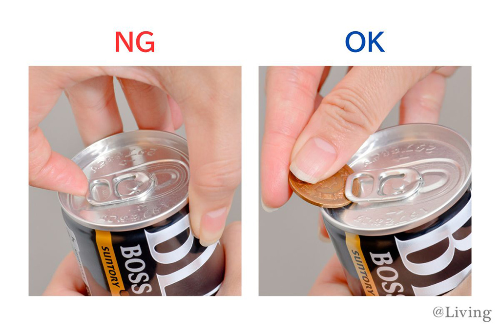 缶コーヒーやお酒など、プルタブを開ける際に「爪の先」を使っていませんか? それだと爪と指がはがれてピンクの部分が減ってしまいます。痛めないためには、プルタブの下に10円玉などの硬貨を挿し込んで開けるようにしましょう。