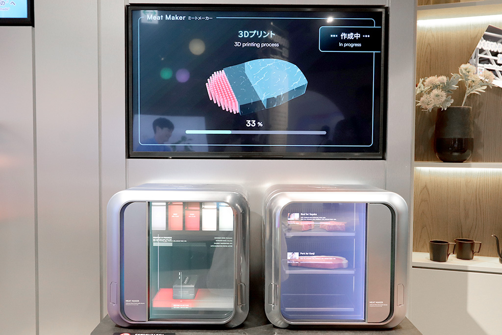 それを可能にするのが、肉の細胞から培養して肉を作る「ミートメーカー(コンセプトモデル)」です。この装置のすごいところはただ単においしいだけでなく、自分の健康や好みにあわせたお肉が作れること。赤身の量や脂肪のバランス、鉄分、ビタミン、ミネラル、食物繊維などの栄養素の量を、自分が摂りたいバランスに調節できるのです。