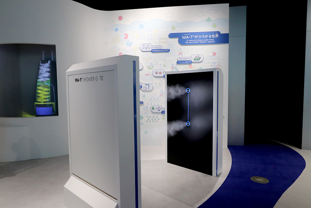 ブースでは、細かいシャワーを浴びるだけで除菌ができるシャワーゲートが展示されています。筆者が体験したところ、少し濡れる感覚はあるものの、すぐにさらっと乾き、無臭でアルコールのような匂いはいっさいあ感じませんでした。