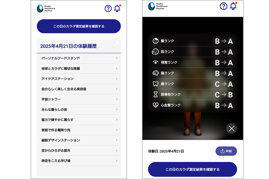 「大阪ヘルスケアパビリオンのアプリから事前登録を行い、QRコードを発行しておくとスムーズにリボーン体験に入れるので、ご来場前の登録がおすすめです。アプリには25年後の自分のアバターと健康データが残るので、体験後の振り返りにも使えます。ちなみにアバターも健康データも、保存しておけるのはこのアプリだけ。ぜひご利用ください。