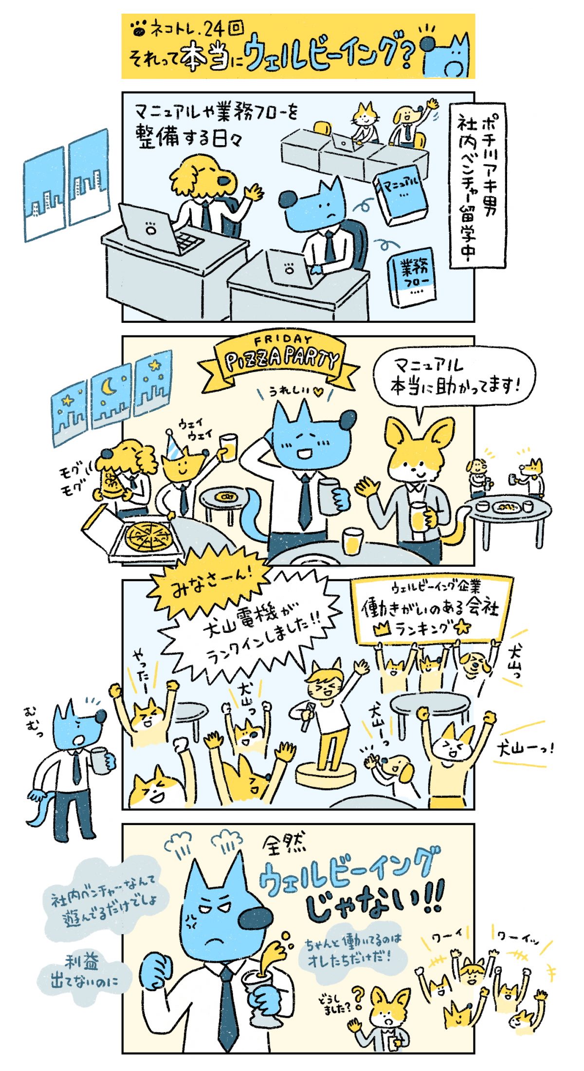 ポチ川「それですよ! いま、基幹事業側で働くのはイヌタイプが多くて、新規事業側はネコタイプが多いんです。で、基幹事業のメンバーは必死にコスト削減してるのに、新規事業のメンバーは利益も出てないのにウェイウェイお祭り騒ぎですよ。マジメに働くイヌ社員を犠牲にして、一部のネコ社員が楽しそうに遊んでるだけの会社が『働きがいランキング入り』なんて、ウェルビーイングだか何だか知りませんけど、あり得ないですよ!」