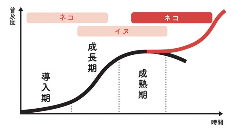 ニャカ山T「ふふふ、そうかもしれませんね。Sカーブの最初にあたる事業の始まり、つまり『導入期』では、何が正解かもわからずルールも定まっていません。この時期には、『どうすればお客さんはもっと喜んでくれるかな?』と、試行錯誤しながら新しい価値をつくっていくことに長けた『組織のネコ』タイプが活躍しやすいです」