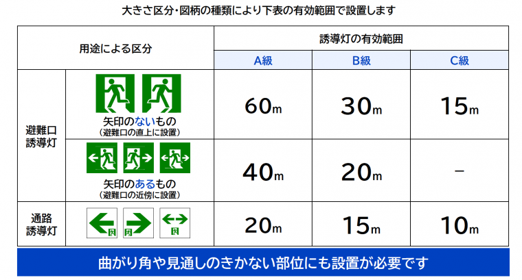 また誘導灯は、設置場所や用途に応じて大きさが区分されている。表示面のサイズが異なれば、有効に視認できる距離も変わるからだ。スペースの広さや設置間隔に応じて、必要な誘導灯のサイズが定められている。