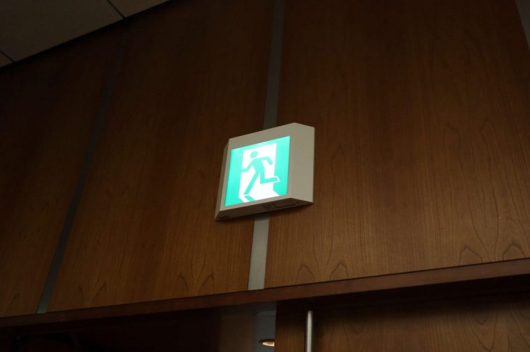 誘導灯には種類がある。避難口の直上に設置され「ここが出口である」ことを示すものと、通路や曲がり角などに設置され、出口の方向を示すものだ。表示面の色も意味を持つ。緑色の背景のものは避難口そのものを表し、白い背景に緑のピクトグラムが描かれたものは、避難口の方向を示す。視認性と理解のしやすさを最優先にした結果、この配色と表現が定着している。