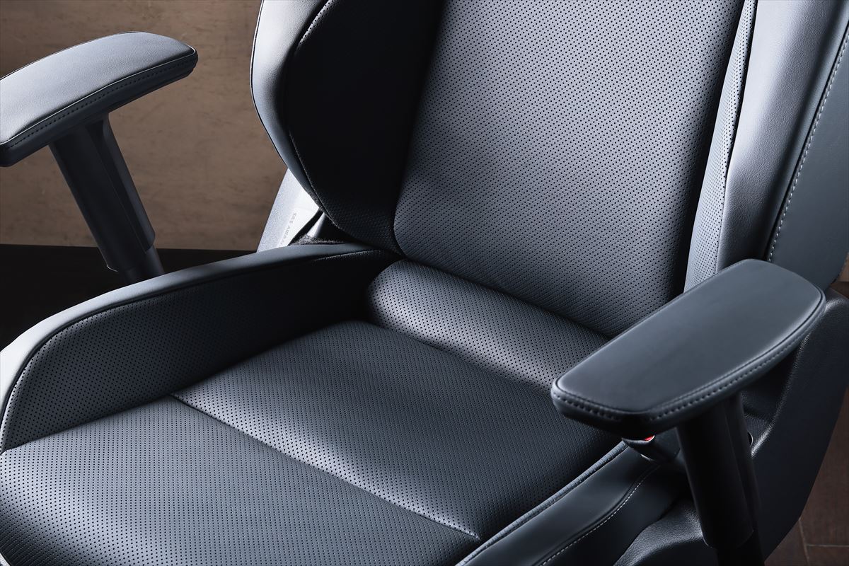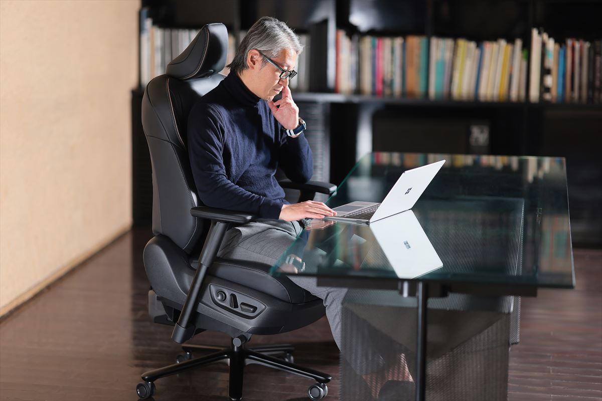 座ってみると深く沈み込みすぎず、それでいて体が包み込まれるような心地よさがあります。シートカバーに使われている本革の手触りも相まって、さながら高級ソファです。ちょっと腰を掛ける感覚で座っても長時間作業のために座っても快適でしょう。