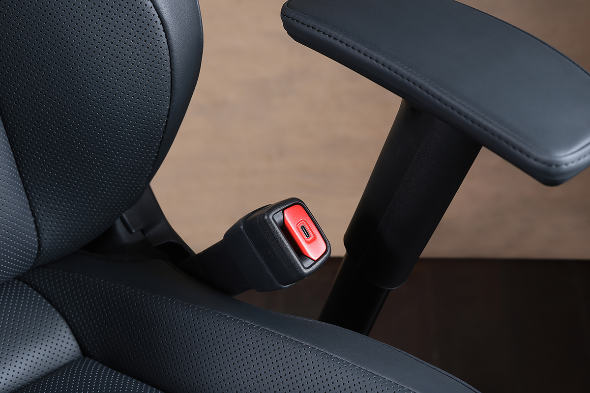 特筆すべき機能として最後にもうひとつ。車のシートといえば、シートベルトは必須機能です。でも、デスクチェアにはシートベルトは不要。ですが、"CROWN SEAT" Desk Chairにはシートベルトのバックルがついています。実はこれ、USB Type-Cポート(出力最大100W)になっているのです。ポータブル電源から供給された電力により、スマートフォンやPCなどを充電できます。