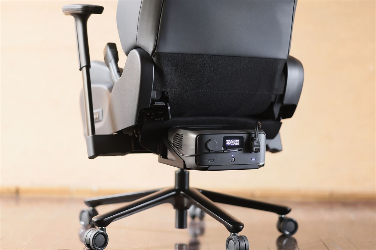 シート背面に搭載したポータブル電源「EcoFlow RIVER 3(230)」(付属)からの電源供給により、各アジャスト機能のレバーを押すだけで無段階に調節が可能となっています。なお、このポータブル電源は市販製品なので、停電など非常時の電源としても利用可能です。