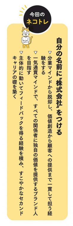 「『自分の名前に“株式会社”をつける』でしょうか。小さな規模でいいので、一気通貫マインドでゼロから一人でやってみる経験をするネコトレです」
