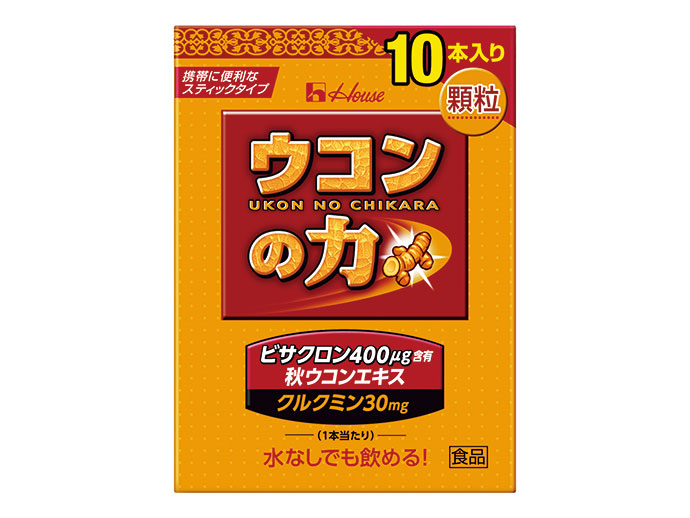 秋ウコン由来の成分は定番の飲料と同じ。水なしで飲める顆粒タイプで、携帯に便利。3袋入り、30袋入りなどもあります。