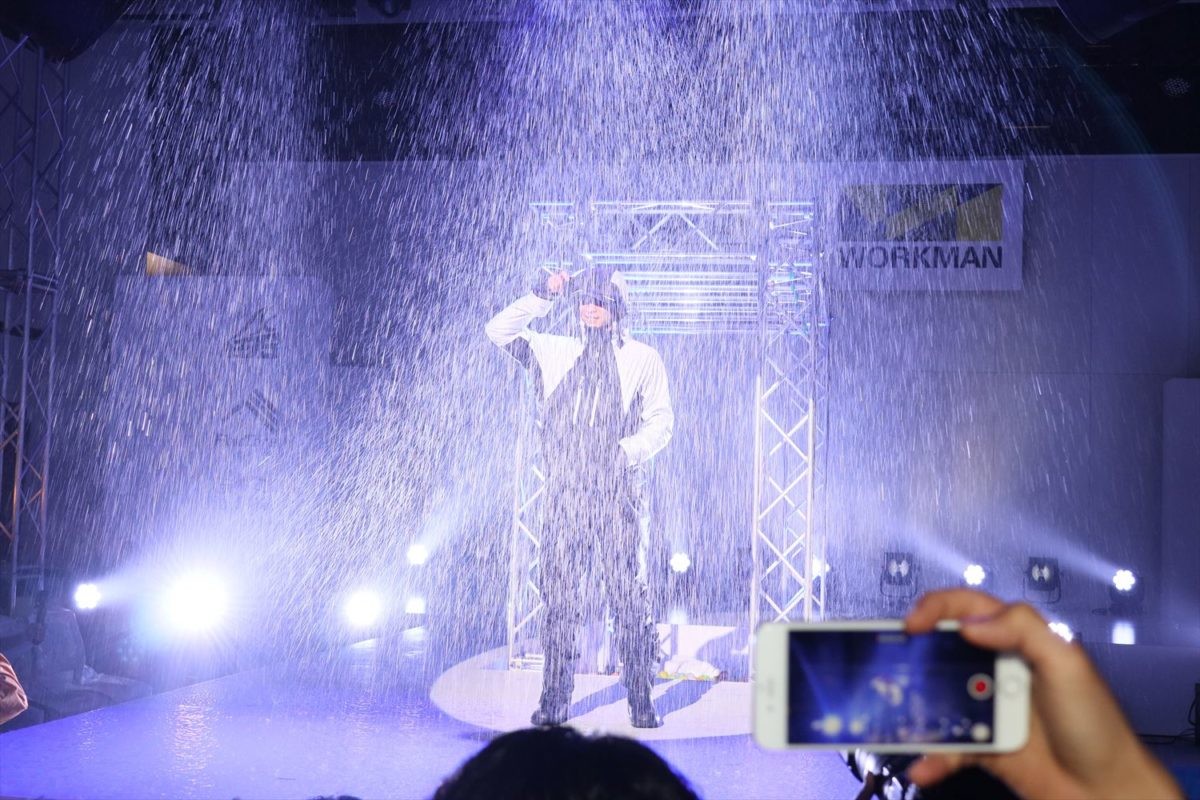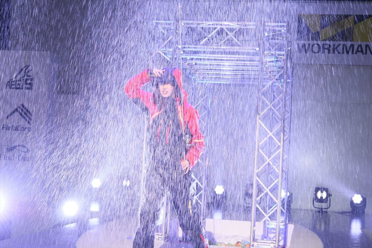 そして本日のハイライト、ランウエイに暴風雨が吹き荒れはじめました。われわれメディア席にも水しぶきが飛んで来ています。カメラがやばい(笑)。そのような中で登場した男女は、ライダーたちの口コミで人気に火がついたAEGISシリーズのフィッシング向け新製品、「オーシャン防水防寒スーツ」(上下セット6800円)のセットアップに身を包んでいました。上下ともに耐水圧5,000mm、リストガード付きで袖口から水が侵入しづらく、パンツの股側に縫い目がなくて水が侵入しづらい仕様です。フードはイヤーホット(フリース)構造で暖かいなど、釣り人にとって嬉しい機能が盛りだくさんです。