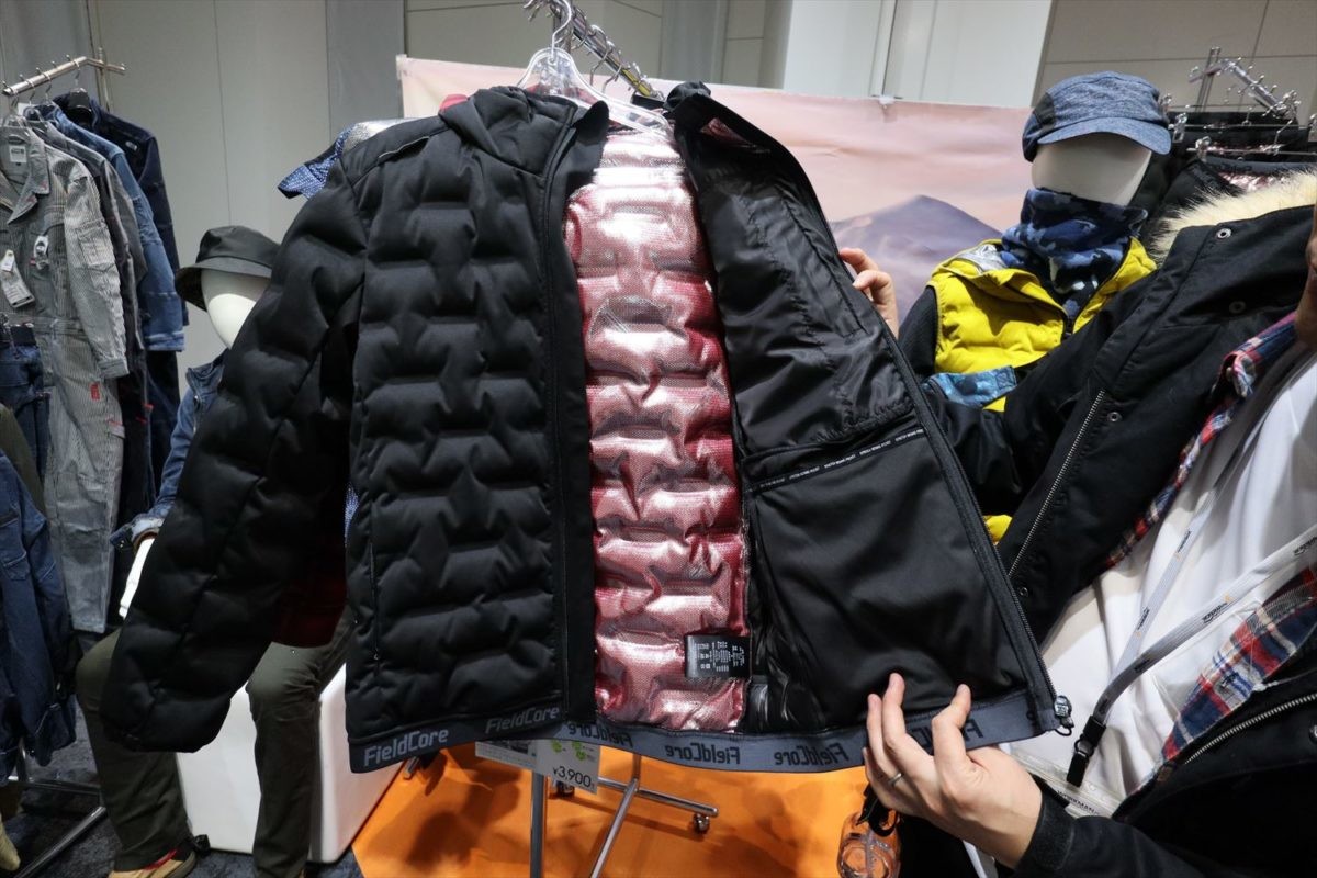 男性がジャケットの下に着ている「Wind Coreヒーターベスト」(9800円※バッテリー込み)には首と腰の部分に電熱線が内蔵されており、バッテリーで最大50℃まで温められます。