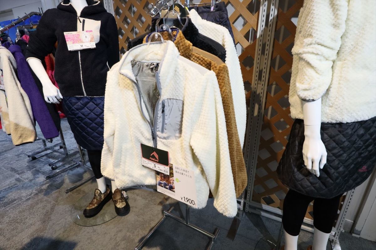 2人目もタウンユースの着こなしです。アウターは保温性の高い裏アルミの「ダイヤフリースジャケット」(1900円)。スカートは、表地は撥水性が高く、中綿入りで防寒性もある「インサレーションラップスカート」(1500円)。シューズは地上4cmの防水とアッパー部分に撥水機能を持つ「中綿入りケベック防寒ブーツ」(1900円)を履いていました。