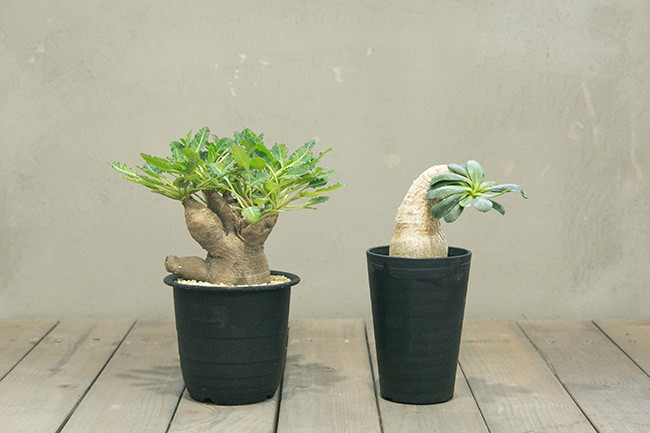 「左側のユーフォルビア 『フィッシュスケール』 は、ゴツゴツした塊根部と、葉脈が白く抜け魚の骨のような葉模様が見どころです。右側のユーフォルビア『プリムリフォリア』は、なめらかな肌とずんぐりむっくりした姿が魅力です。
