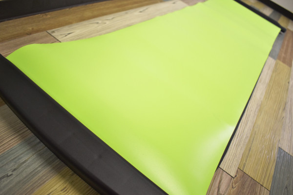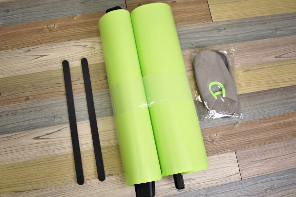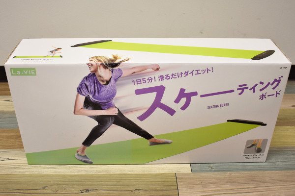 ビッグサイズの箱に入った同商品は、1日にたった5分だけ滑ればダイエットになるよう。箱を開封すると、本体、スケーティングシューズ、2本のクッションシートがお目見えします。本体のサイズは約184(幅)×58(奥行)×5cm(高さ)で、スライド面は170×50cmほど。耐荷重はおおよそ80kg程度です。ポリプロピレンや塩化ビニル樹脂で作られており、黄緑色のシートはスベスベとした触り心地でした。