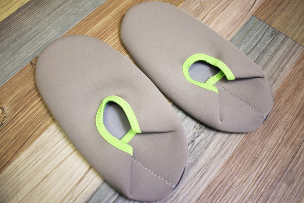 グレーカラーのスケーティングシューズは、スリッパや靴下によく似たデザイン。ポリエステル&ナイロン製でやわらかく、足裏はツルッとしています。足のサイズが約23~26cmの人なら問題なく履けるはず。