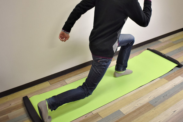 スケーティングシューズを履いて滑ってみると、予想以上に滑り心地がよくてびっくりしました。スーッと滑るのが爽快で、まるでスケートをしているみたいです。しかし摩擦力が少ないせいか、その場で立つのもひと苦労。次に“ランジ ラン”という運動を行ってみたところ、足・太ももがしっかり鍛えられている感じがします。これなら5分滑るだけでもダイエットになりそう。