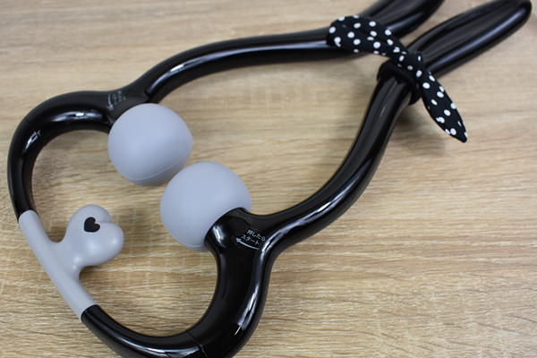 うさぎがモチーフの同商品は、首のコリにきくマッサージグッズ。サイズは約190(幅)×360(長さ)×45mm(高さ)、重さは300gほどです。うさぎの耳にはリボン型のヘアゴムもついているため、見た目はとてもキュート。