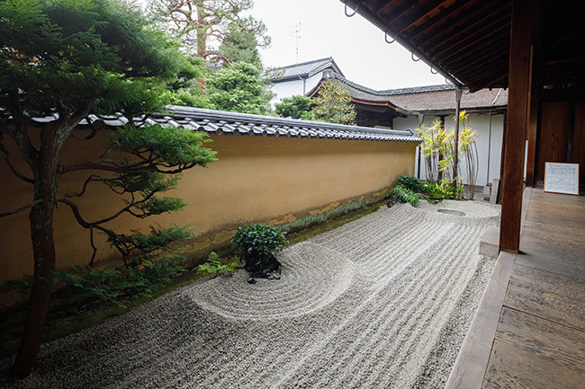 壺庭は、京都特有の夏の暑さをしのぐための重要な空間。ただしここは、方丈と庫裡の屋根が接近して日差しが遮られるため植物が育たず、昭和35年に石庭として作りなおされたそう。