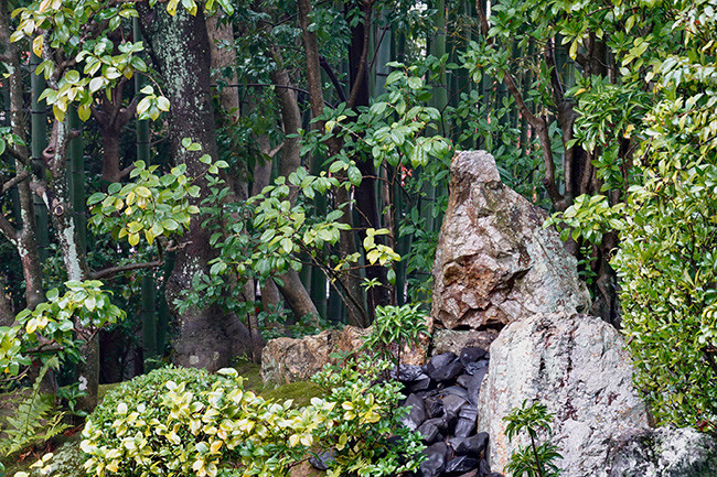 キリシタン大名だった大友宗麟にちなみ、縦に4個・横3個の石を配して十字を作っているのが、日本庭園としては新鮮に感じられます。「十字架の庭」とも呼ばれています。