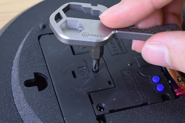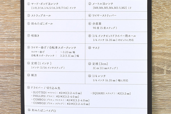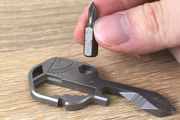 カクカクと段差がついている穴は、「レンチ」として使うことができます。ヤード・ポンド法サイズとメートル法サイズに対応しており、身近にある小さめの六角ボルトなら難なく使えそう。また六角形に開いている穴は「ビットドライバー用ホール」です。1/4インチのドライバービットを差し込んでみたところ、見事にジャストフィット。ドライバーとして問題なく使うことができました。ほかにも持ち手部分は「分度器」や「刻みたばこパイプ口」などの機能も兼ね備えています。