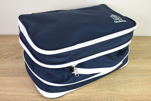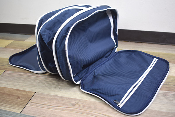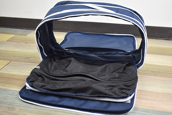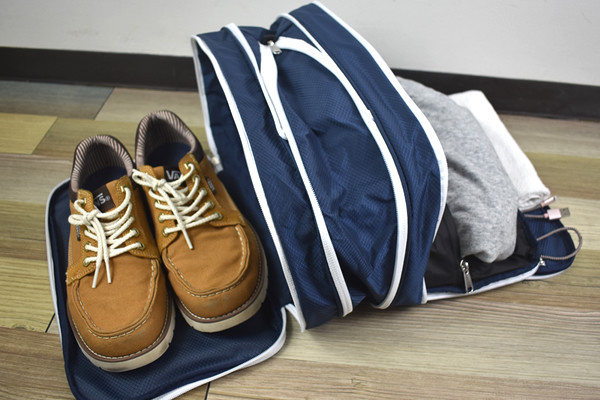 左右のファスナーを開いて中の収納スペースを確認したところ、4層に区切られていることがわかりました。1層目には汚れた衣類か靴、2層目には濡れたタオルや服・水着、3層目にはキレイな衣類、4層目にはスマホの充電ケーブルなどを種類別に収納すると良さそう。それでは靴や衣類などを収納し、圧縮してみます。