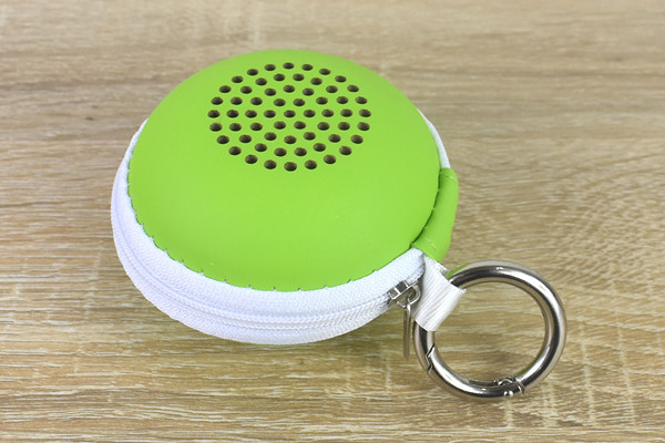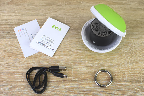 さっそく箱の中を確認してみたところ、入っていたのはBluetoothスピーカー、マイクロUSB充電ケーブル、キャリーケース、メタルバックル、取り扱い説明書。メタルバックルをケースに取りつければ、キーホールダー感覚で持ち運びできます。