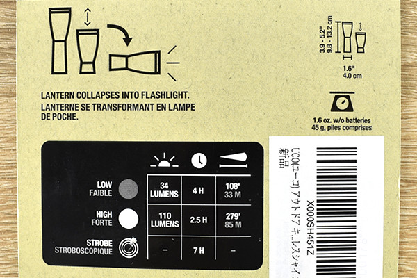 夜のアウトドアシーンで必要不可欠なライトですが、できるだけ荷物にならない製品を選びたいですよね。収縮する「LESCHI」は、収納時の大きさがわずか10cmほど。伸ばした状態でも約13cmしかありません。文字通りの“手のひらサイズ”で驚きです。ちなみに重量は電池を入れた状態で約70g。とことんミニマムなアイテムですね。