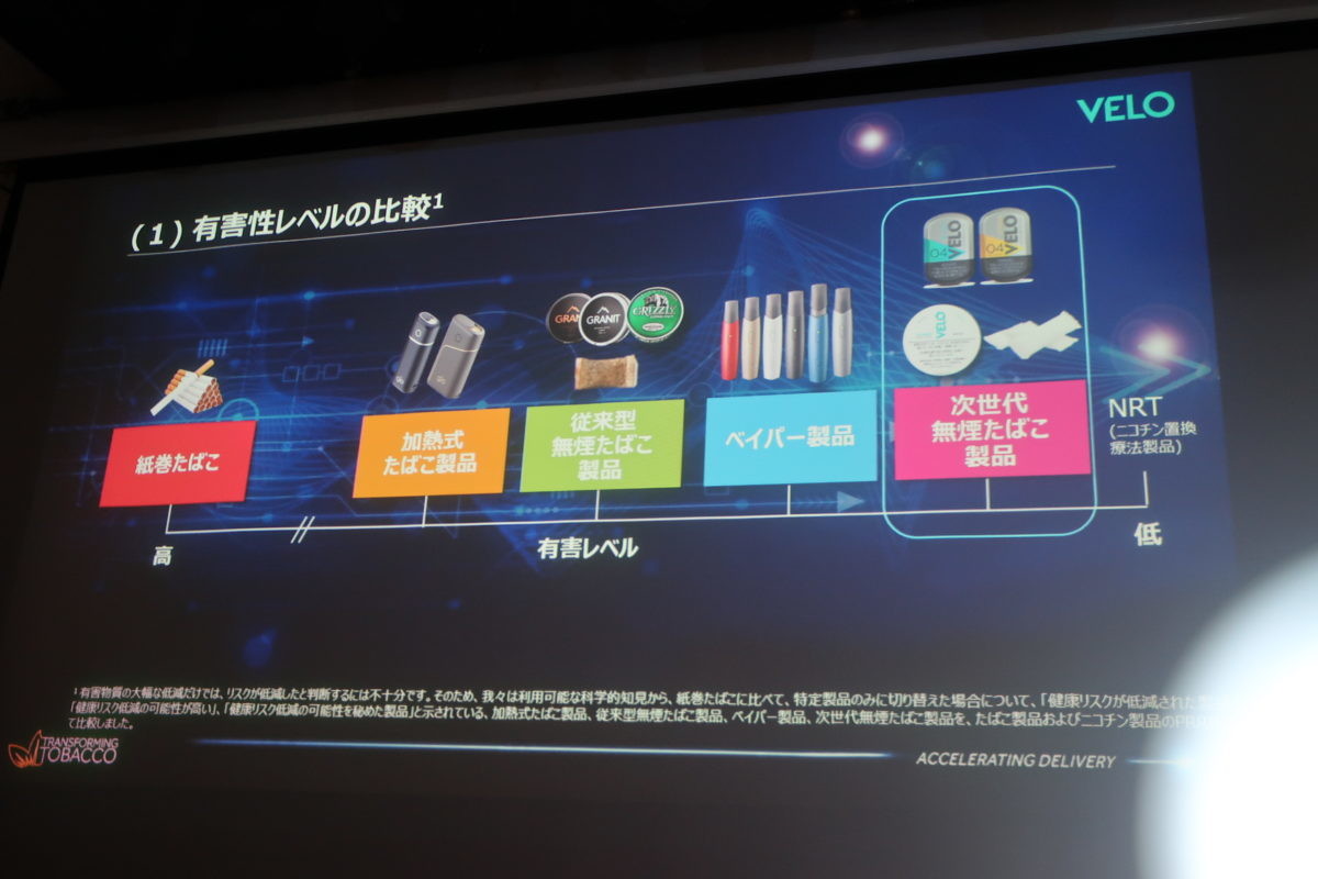 続いて、BATグループ英国本社 PRRP研究開発部門グローバル責任者 ジェームズ マーフィー氏が登壇。「喫煙関連疾患の主な原因は、たばこの燃焼に伴い発生する有害性物質であり、ニコチンではない」など、科学的知見からたばこやVELOについて語られました。