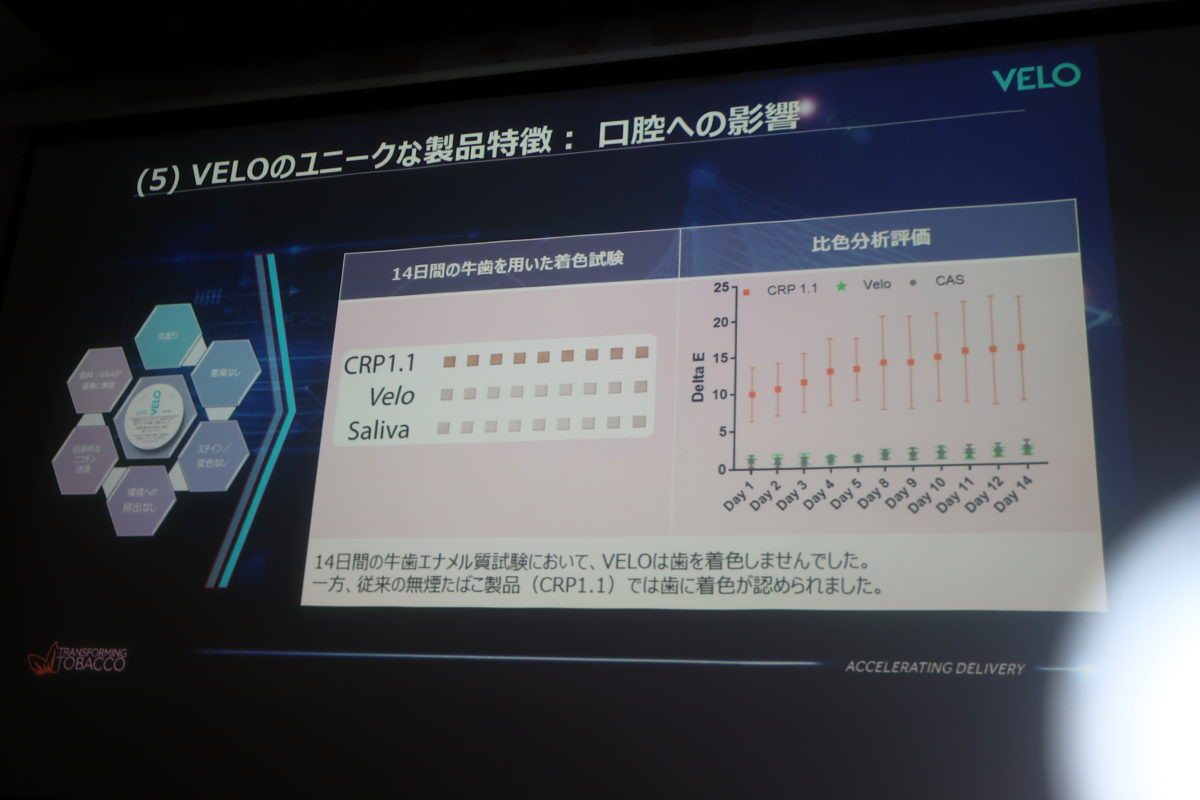 特徴は、火やデバイスを使用しないことと、燃焼や加熱をしないため煙が出ないことです。BATジャパン 社長 ジェームズ山中氏はVELOについて「副流煙が発生しないので改正健康増進法の規制対象外」と説明し、「紙巻たばこなどに比べてVELOは制約が少なく、いろいろな場所で使える」とのこと。