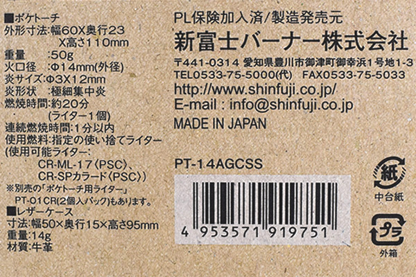 「ポケトーチ」は、レザーケースと使い捨てライター1個がセットに。本体の大きさは約60(幅)×23(奥行)×110mm(高さ)で、手のひらほどのサイズ感でした。こんなミニサイズなのにバーナーだとは驚きです。